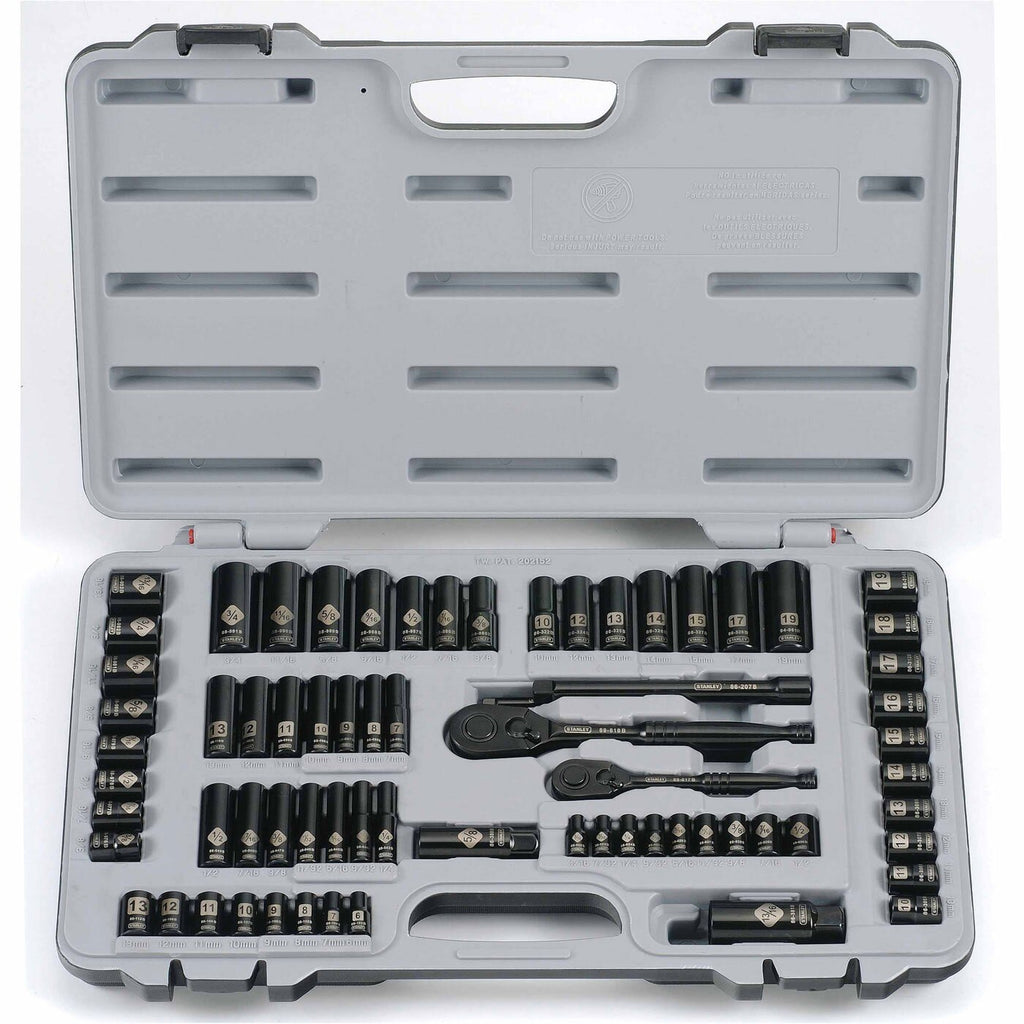 •Meets and exceeds the American National Standards Institute (ANSI) specifications for combination wrenches, sockets, and ratchets. •Floating pawl ratchets are high torque ratchets. •Laser etched sockets provide hi-visibility markings making it easier to read compared to standard marked sockets. •Better corrosion resistance when compared to regular chrome sockets. •2-piece cases allow for lid removal and enable the back case to be used as a drawer tray; an easy reassemble of the lid to the case provides for convenient tool storage travel. •Black chrome sockets provide a sharper appearance. •Includes: 30, 1/4" MaxDrive™ Sockets; 33, 3/8" MaxDrive™ Sockets; 1, 3/8" Pear Head Ratchet Arm; 1, 1/4" Pear Head Ratchet Arm; 1, 3/8" Spark Plug Socket, 5/8"; 1, 3/8" Spark Plug Socket, 13/16"; 1, 1/4" Extension bar, 3"; 1, 3/8" Extension bar, 6"; Blow Molded Case; Color Graphics Sleeve; PVC cover highlighting product.
