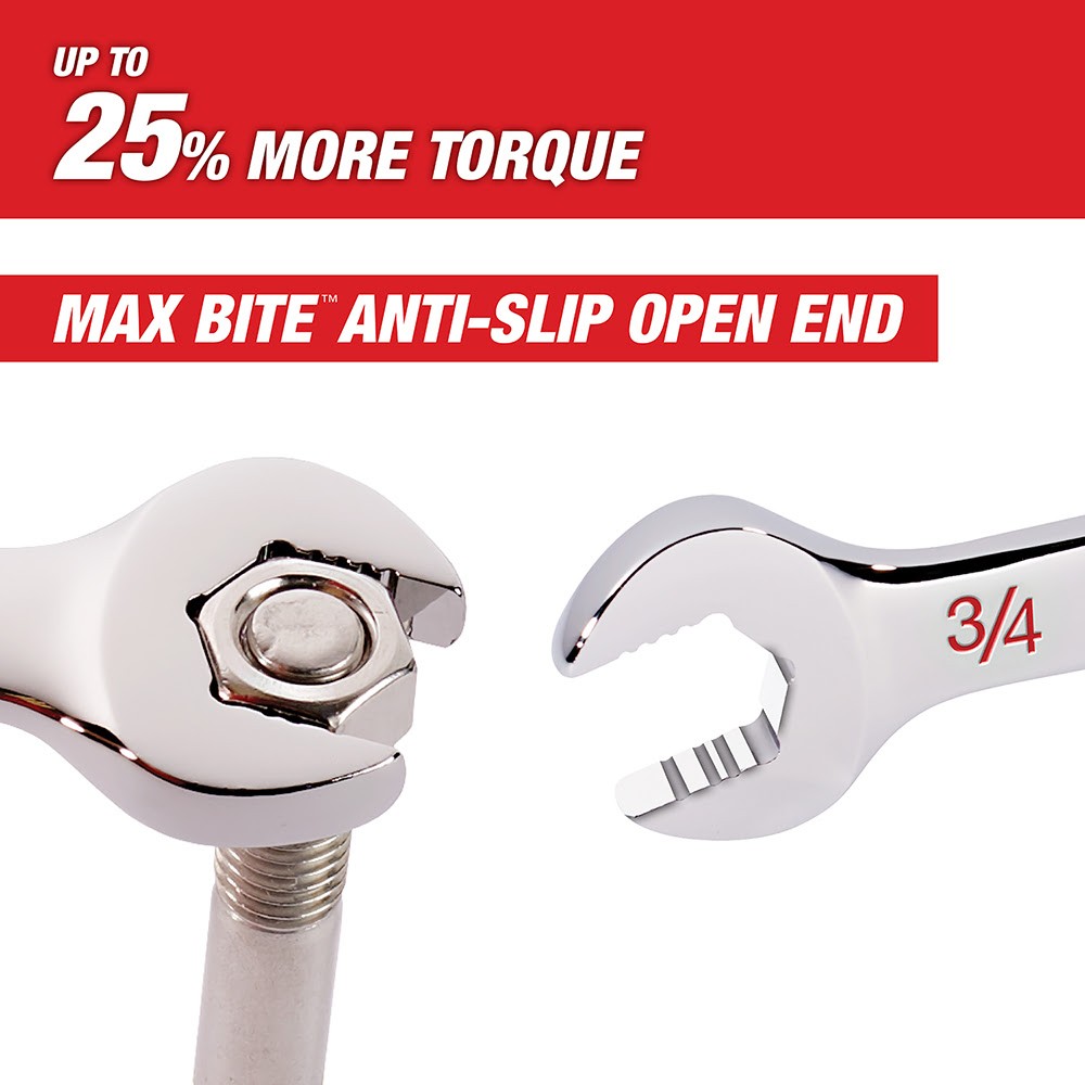 Milwaukee’s Ratcheting Combination Wrenches offer an industry-leading 2.5° of Arc Swing, allowing our users to work quickly and efficiently even in the tightest of spaces. Our Durable Double-stacked Pawls in the ratcheting mechanism offer longest ratchet life and best access with 144 ratcheting positions. The MAX BITE™ Open-End Grip improves the wrench's grip on nuts and bolts, offering 25% More Torque than smooth-faced wrenches. The Comfortable I-Beam Handle Design allows superior user comfort. Milwaukee wrenches feature Ink-Filled Size Labels for easy size identification, as well as quick distinction between SAE and metric sets. The 15pc sets come in trays designed for steel storage drawers, allowing for efficient storage with no wasted space. The 7pc kits come in a portable, locking storage tray, offering organization both on and off the jobsite. Standing behind our products, Milwaukee offers a Lifetime Guarantee on all of our Ratcheting Combination Wrench Sets.